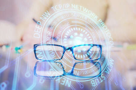 Data tech hologram with glasses on the table background. Concept of technology. Double exposure.
