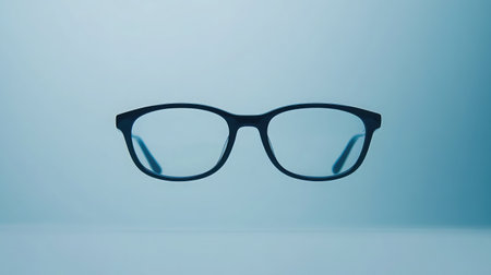 Stylish eyeglasses with thin black frames and clear lenses are levitating against a light blue backdrop, creating a clean and modern aesthetic, perfect for showcasing eyewear or vision care