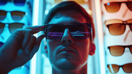 Close-up portrait of a programmer trying on sunglasses reflecting code in a futuristic optics store with neon lights