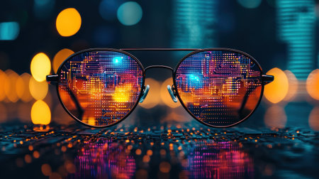 A pair of futuristic glasses displays a digital overlay, symbolizing the intersection of technology and urban life. A vibrant city atmosphere enhances the innovation theme.