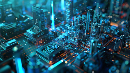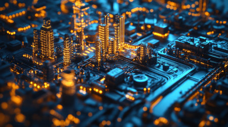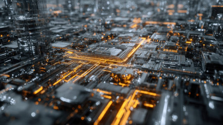This abstract image showcases a futuristic cityscape with intricate circuits and glowing orange lines, symbolizing advanced technology and connectivity in a digital environment.