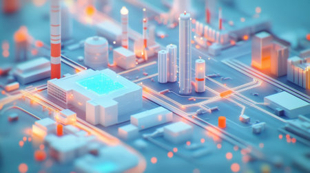 A vivid aerial view of a futuristic cityscape illuminated by warm glowing lights, showcasing intricate infrastructure and advanced technology in a modern urban environment.