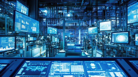 This image showcases a detailed control panel filled with graphs and diagrams in an industrial setting, highlighting automation and data monitoring capabilities.