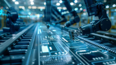 State-of-the-art PCB assembly line with advanced robot arms at Electronics Factory, precise component installation and quality control in electronic device production