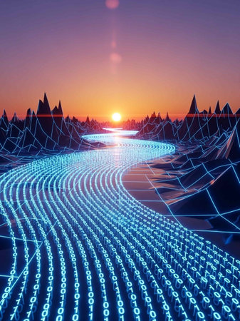 A futuristic digital landscape featuring a winding path of binary code, set against a vibrant sunset backdrop with geometric mountains and a purple sky.