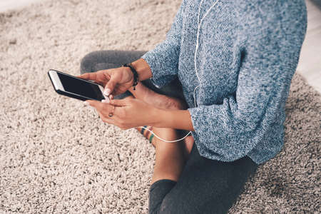 Wireless head phones concept. Cropped close up view photo of stylish trendy confident attractive pretty beautiful lady holding using telephone gray head phones in hands