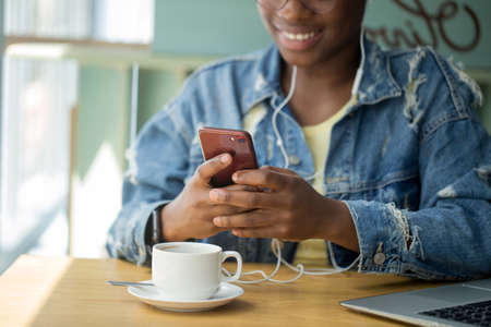 Unrecognizable dark-skinned woman in denim jacket, talking with her boyfriend, using headset smiling, sitting at well-lit place, holding in hands smartphone, laptop and coffee in front of her.