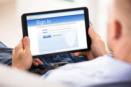 Close-up Of A Man Signing Up User Name And Password On Application Using Digital Tablet