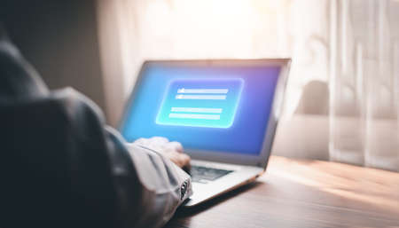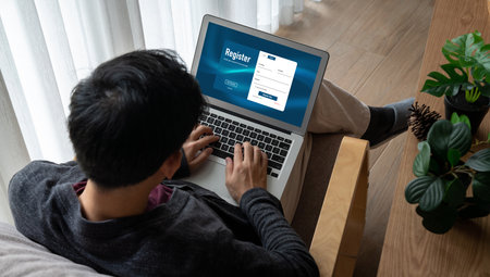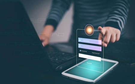 man using laptop computer and sign up or log in username password virtual touch screen.