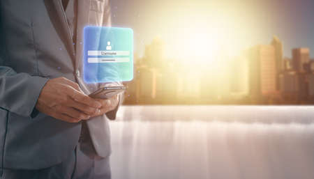 Man use a smartphone type the username and password. User privacy security and protect personal data internet network. Cyber ​​security and digital data protection technology concept.