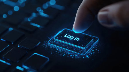 A close-up image of a finger poised over a brightly illuminated Log in button on a keyboard, emphasizing the modern interface and digital interaction in technology.