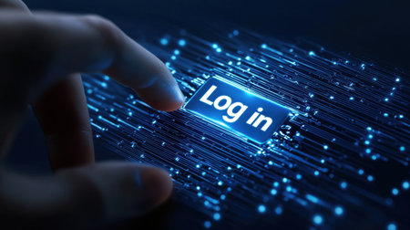 A close-up of a hand reaching for a glowing 'Log in' button, symbolizing user access and cybersecurity in a high-tech digital environment, perfect for technology themes.