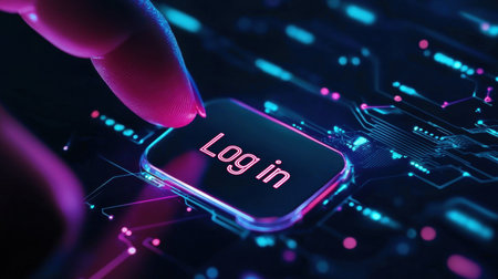 A close-up image of a finger poised to touch a glowing neon 'Log In' button against a vibrant circuit board background, symbolizing digital technology and online access.