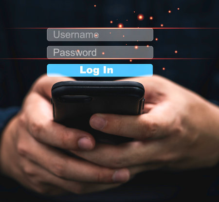 Close-up of hands holding a smartphone with a digital login screen displaying username, password, and log in button.