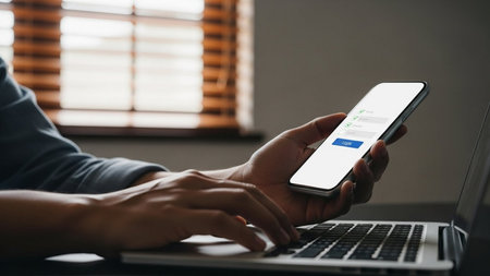 Hand interacts with smartphone displaying online payment confirmation in a digital banking setup, highlighting the future of cashless transactions and shopping.