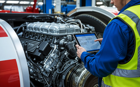 Automotive engineer using a digital tablet, inspecting and controlling a truck engine in a modern factory