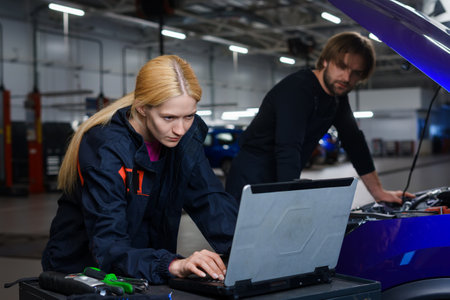 Two colleagues of auto electricians are standing at the hood of a car with diagnostic equipment. A young woman writes down the readings in a laptop. Modern diagnostic station