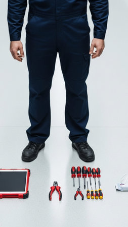 A vertical (9:16) cinematic full body shot of a modern tradesperson in a clean uniform standing in a