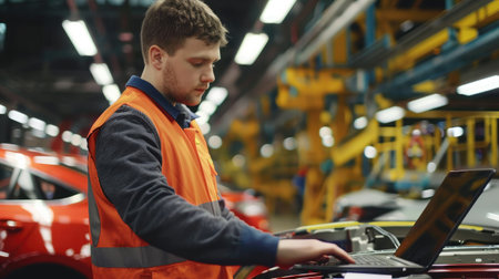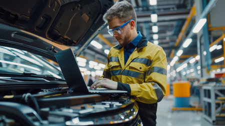 Man in car factory uses laptop, focusing on engineering. Keywords glasses, computer, engineering, netbook