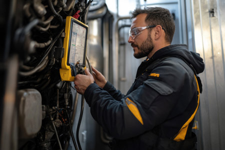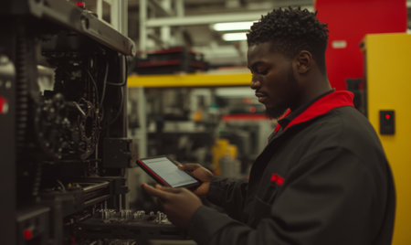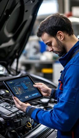A mechanic in a blue shirt uses a tablet to perform diagnostics on an engine in a modern automotive workshop, showcasing the integration of technology in vehicle repair.
