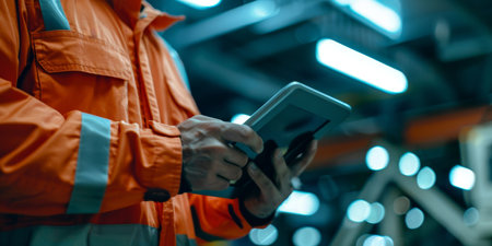 A man in an orange jacket is holding a tablet in his hand. He is wearing a reflective vest and he is working in a construction or industrial setting. The tablet could be a tool for communication