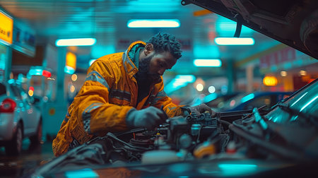 A mechanic works on a car engine in a repair shop, sharp focus on tools and engine details, blue neon lighting