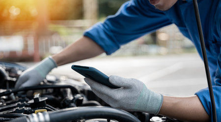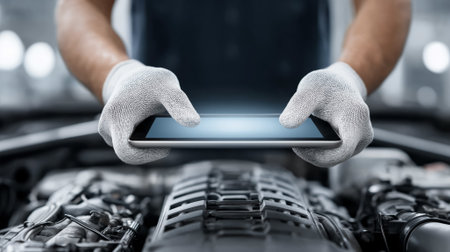Hands holding a tablet with ar diagnostic software overlay on a car engine