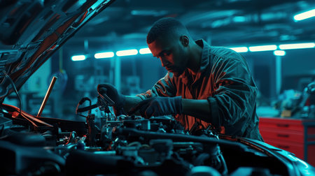 A mechanic is working on a car engine with his gloved hands. Concept of precision and expertise, as the mechanic carefully handles the engine parts. The blue lighting adds a cool