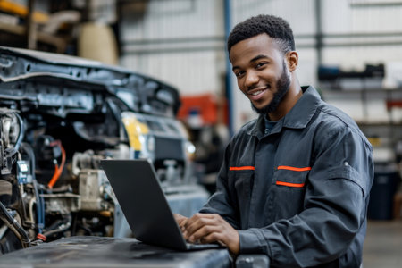 A cheerful young Black mechanic, wearing a work uniform, uses a laptop while inspecting a truck in a busy repair workshop. The background features various tools, a partially disassembled truck, and a well-organized workspace.