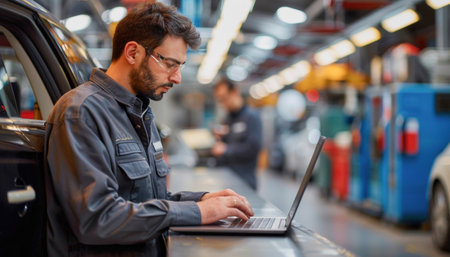 auto mechanic working with laptop computer in auto repair shop. automotive industry