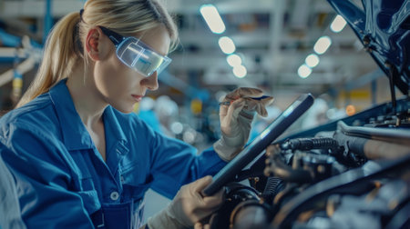 Female mechanic inspects a car's V6 engine with an Augmented Reality Diagnostics software on a tablet computer. Premium car service.