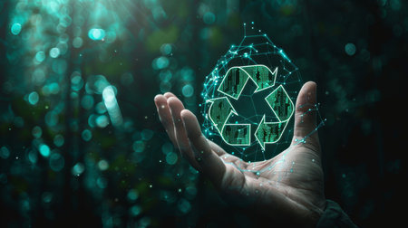 Close-up of a hand holding a green recycle symbol, symbolizing sustainability on a digital background.