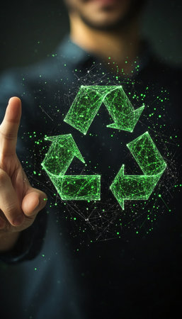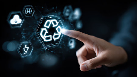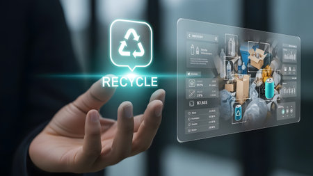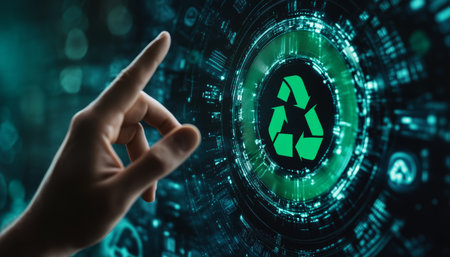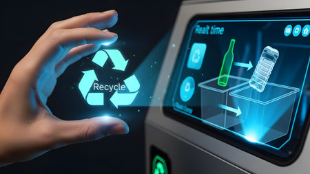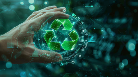 A hand interacts with a holographic recycle symbol and a smart sorting machine display. Clear det...