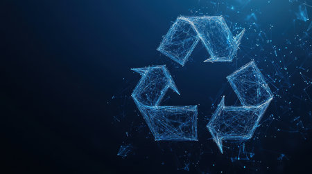 A wireframe recycling logo stands out in a sleek silhouette on a dark blue background, emphasizing eco-consciousness with modern style.