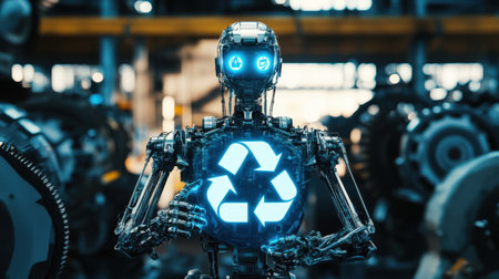 A futuristic robot stands in a modern factory, holding a glowing recycling symbol. This image highlights themes of technology, sustainability, and innovation in industry.