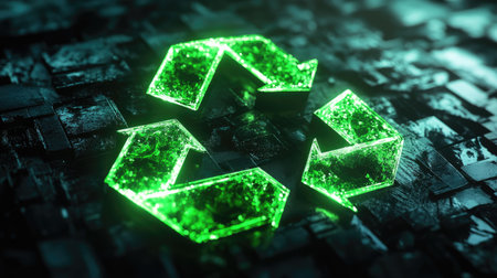 A high-tech recycling background with a glowing, digital symbol in neon green, set against a dark, futuristic backdrop with subtle grid patterns.
