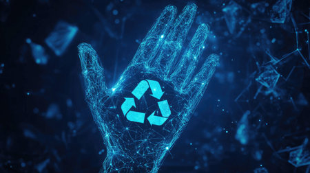 A futuristic blue background featuring a holographic recycling sign and a hand, illustrating the concept of innovative solutions for garbage disposal and environmental protection.