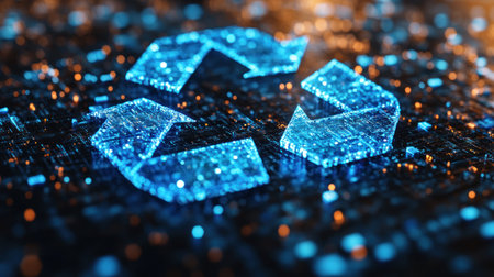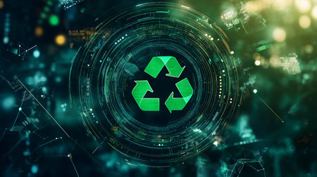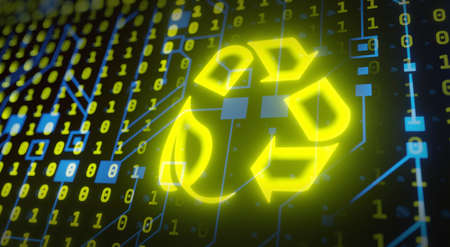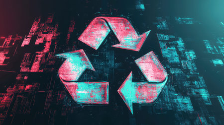 A vibrant recycling symbol shines amidst a backdrop of digital patterns and lights.
