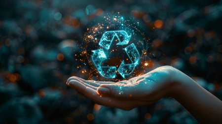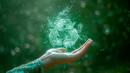 Hand holds holographic recycle icon and waste management data display Clear details and vibrant c...