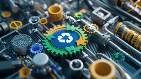 A green and blue gear with a recycle symbol on it is surrounded by other gears. Concept of recycling and the importance of taking care of the environment