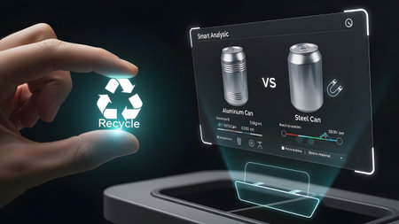 A hand points to a holographic display comparing aluminum and steel cans for recycling. Clear det...