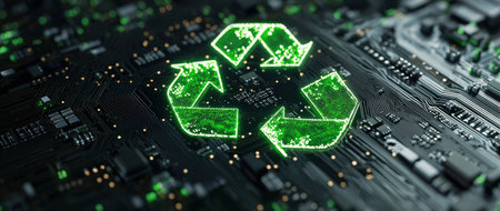 Green recycling symbol on a circuit board, representing eco friendly technology and sustainable innovation with vibrant colors and a modern design