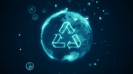 Recycling icon, waste data management and sustainable industry symbol digital concept. Network, cyber technology and computer background abstract 3d illustration.