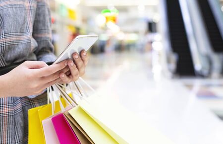 Woman hand using smartphone with shopping mall colorful beautiful bokeh background. Business, financial, trade stock maket and social network concept.