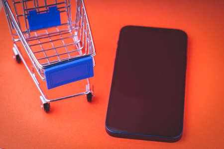 An empty shopping cart and a modern smartphone on a red scarlet background.