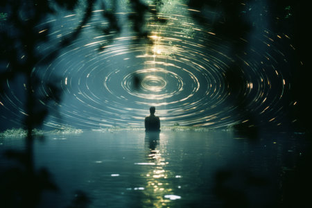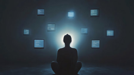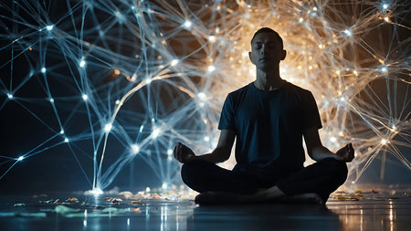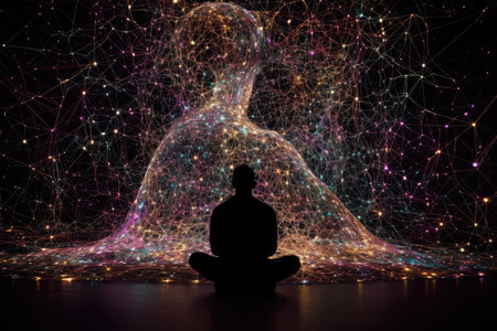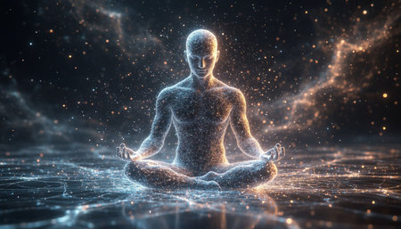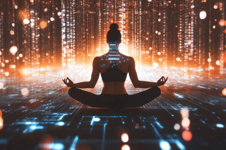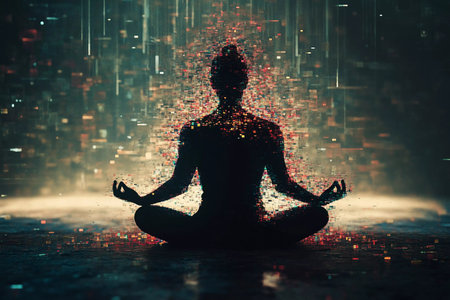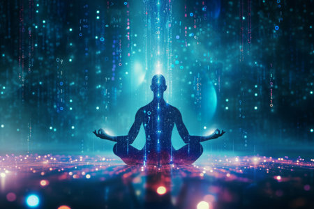 A person sits cross-legged in a meditative pose surrounded by vibrant digital patterns during twilight.