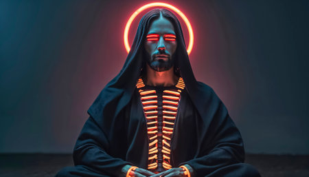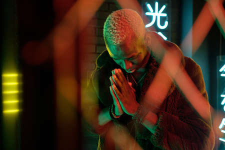 African cyberpunk man in fur coat praying in darkness with neon hieroglyphs meaning nirvana and western paradise in the background