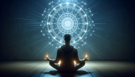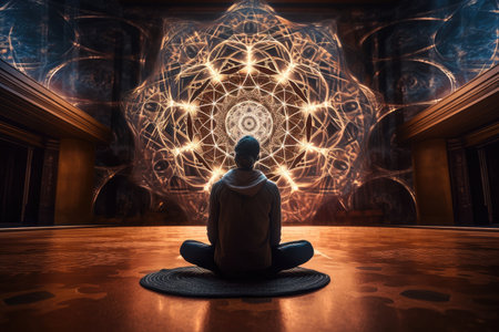 person, meditating on mandala and experiencing the peace and serenity of sacred geometry, created with generative ai