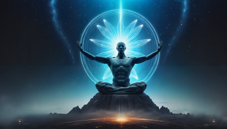 A high-tech AI robot sits in a meditative pose on a glowing surface, radiating bright light. The intricate design and serene expression evoke a sense of calm and futuristic technology.. AI Generation