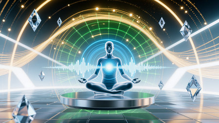 A serene figure meditates amidst shimmering crystals and sound waves in a digital world.
